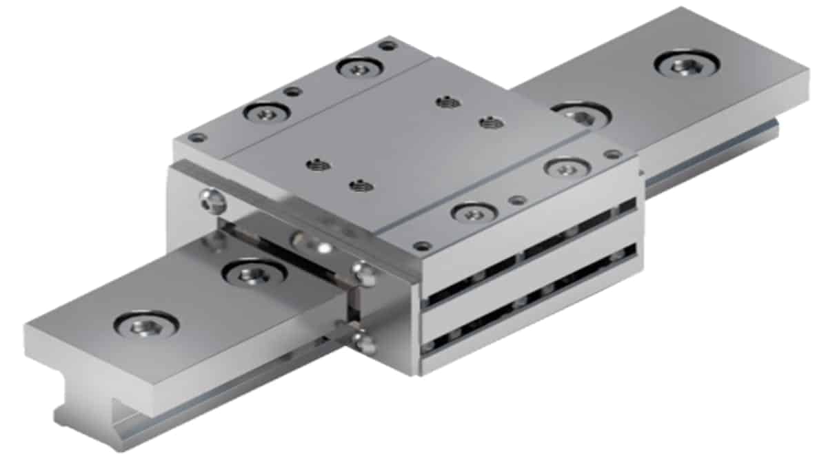 - Rolling guides:Rolling guides generally include all linear guides in which rolling elements are used. Basically, these include rail guides (profiled rail guides, telescopic rail guides and cage rail guides) and shaft guides. Profiled rail guideways are a widely used linear guideway in mechanical engineering. In rolling guides, rolling elements roll between the carriage and the guideway on hardened raceways. The rolling elements form a circuit due to the recirculation in the carriage; this design enables endless guidance with unlimited stroke. The rolling elements used are balls (linear recirculating ball bearing and guideway assemblies or linear recirculating ball bearing and guideway assemblies), rollers (roller guideways or linear recirculating roller bearing and guideway assemblies) or track rollers with rolling bearings (track roller guideways). The principle of multiple point contact ensures lower friction than with sliding guides and optimally distributes the forces acting on the guide. Rolling guides can support high loads in a small space.